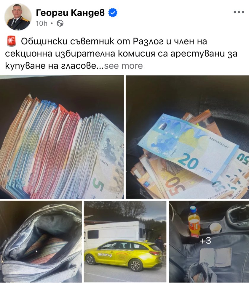 Полицията е задържала общински съветник от Разлог и член на секционна избирателна комисия по подозрение за купуване на гласове. Информацията беше съобщена във Facebook от и.д. главния секретар на МВР Георги Кандев.
