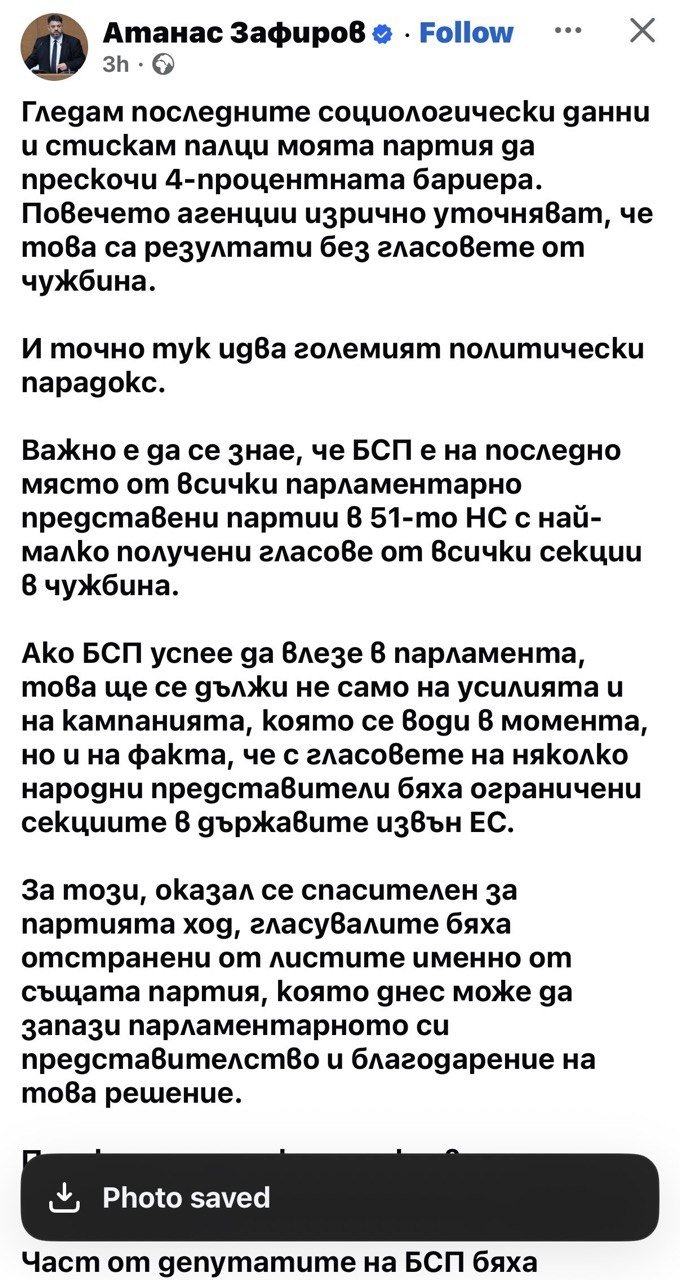 Ако БСП успее да влезе в парламента, това ще се дължи не само на усилията и на кампанията, която се води в момента, но и на факта, че с гласовете на няколко народни представители бяха ограничени секциите в държавите извън ЕС.
