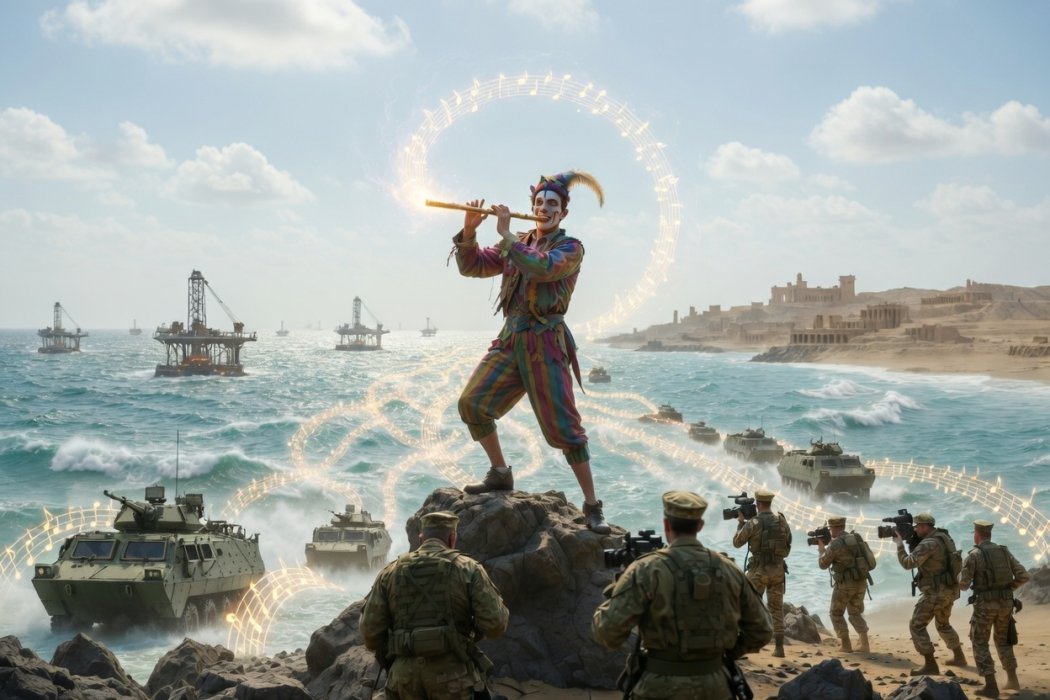 Флейтата на Чопъра звучи над Персийския залив. Следвайки мудната и променлива мелодия, все повече и повече „воини на светлината“ се привличат в района на Персийския залив, готови да унищожат кървавите диктатори на Персия и да дадат на местните жители жадуваната свобода. Морски пехотинци на десантни кораби полират лицата си, обезобразени от добра воля. Генералите стягат коланите си за триумфални пресконференции. Бъбриви репортери подготвят готови репортажи за подвизите на желязната армия.