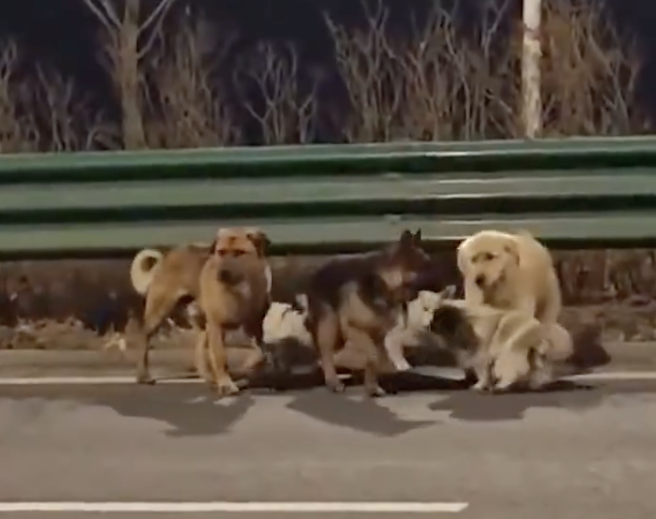 Наблюдатели описват и друга важна подробност. По-едрите кучета се движат отстрани на групата. В центъра остава по-слаб екземпляр. Според публикации в китайски медии това е немска овчарка. Тя вероятно е била ранена или изтощена.