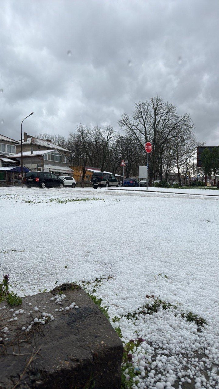 Видеата показват интензивен валеж от ледени зърна. Явлението е било кратко, но силно.