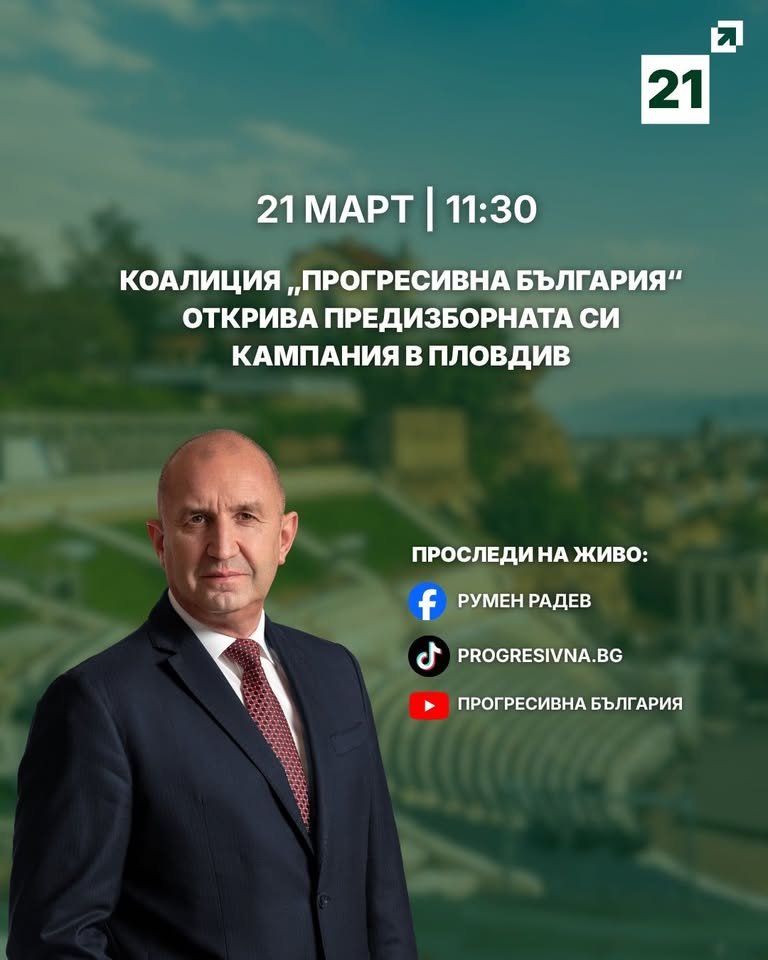 Коалиция „Прогресивна България“ ще даде официален старт на предизборната си кампания днес, 21 март, в Пловдив. Началото на събитието е насрочено за 11:30 часа.