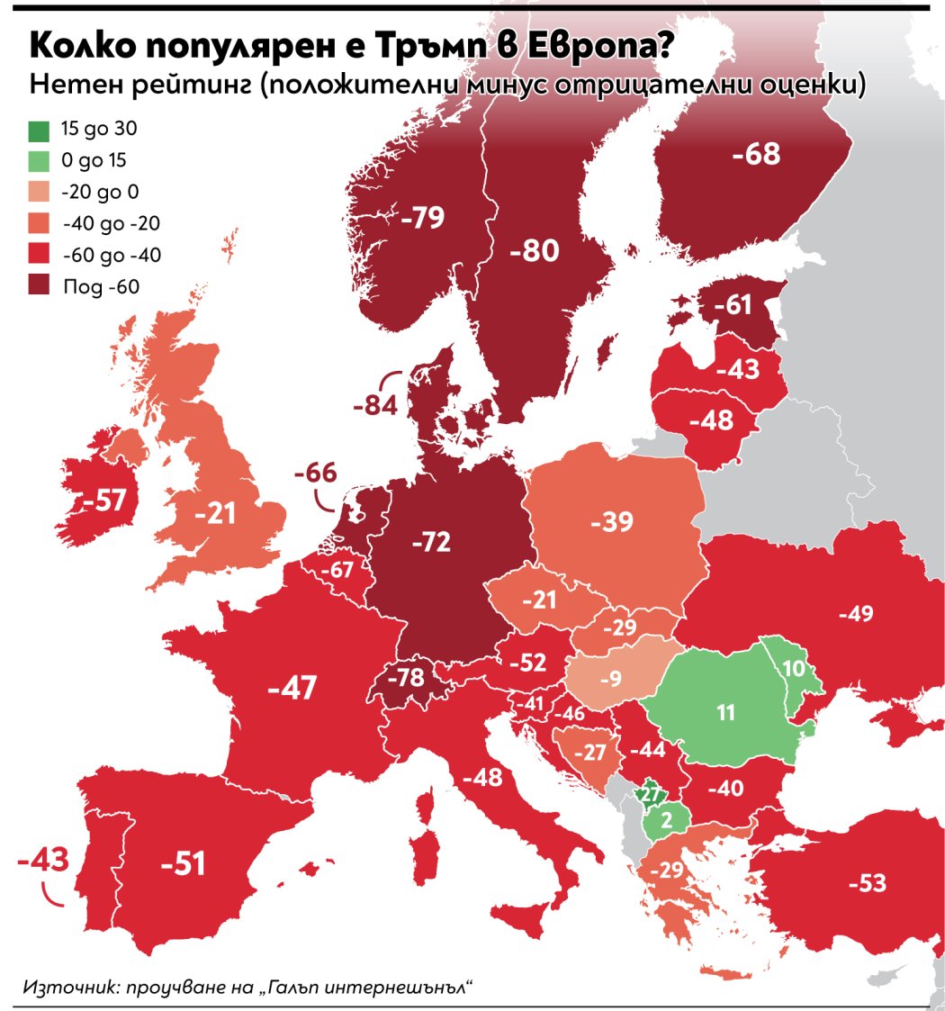 Проучване на „Галъп интернешънъл“ очертава ясна картина. Президентът на САЩ Доналд Тръмп не среща топло отношение в Европа. В много държави неодобрението доминира. Най-силно е в Северна и Западна Европа.