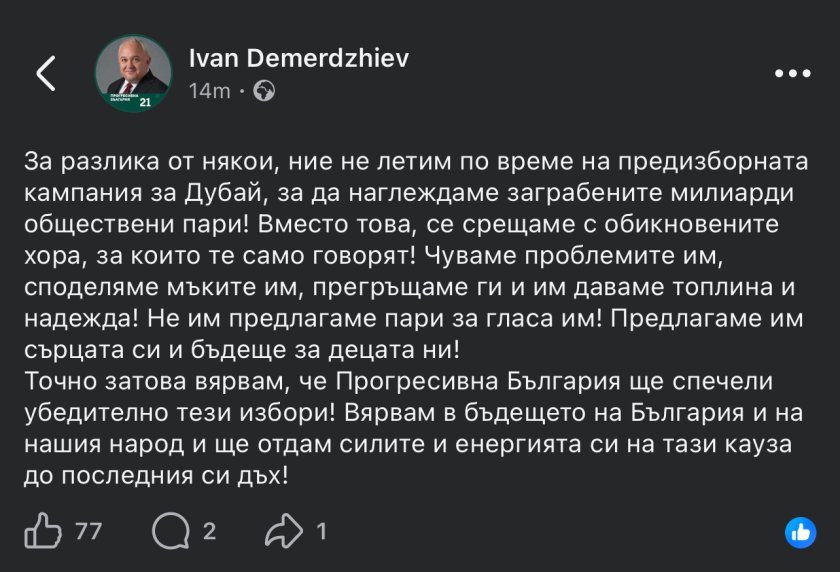 В публикацията си той изразява увереност, че този тип кампания ще доведе до убедителен изборен резултат. Според него подкрепата ще дойде именно от гражданите, които търсят реална промяна и различен подход към управлението.