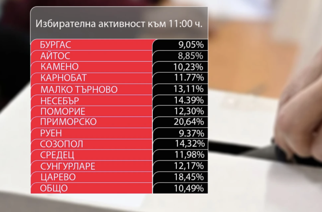 Избирателната активност в страната продължава да се повишава в хода на изборния ден към 11:00 часа, като в различните области се наблюдават значителни разлики в участието на гражданите.