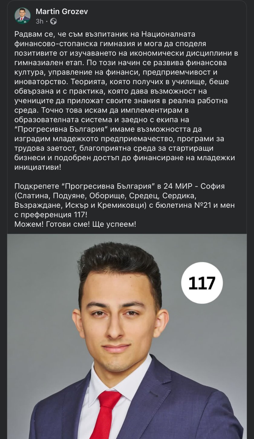 В края на позицията си Мартин Грозев отправя призив за подкрепа на „Прогресивна България“ на предстоящите избори.