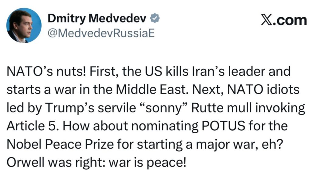 "НАТО е лудост! Първо САЩ убиват лидера на Иран и започват война в Близкия изток. След това идиоти от НАТО, водени от подчинения на Тръмп „син“ Рюте, започват да обсъждат прилагането на член 5. Какво ще кажете да номинирате президента за Нобелова награда за започване на голяма война? Оруел беше прав: войната е мир!", написа Дмитрий Медведев в Х.