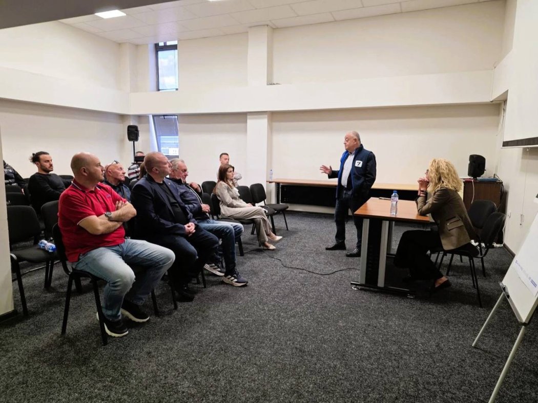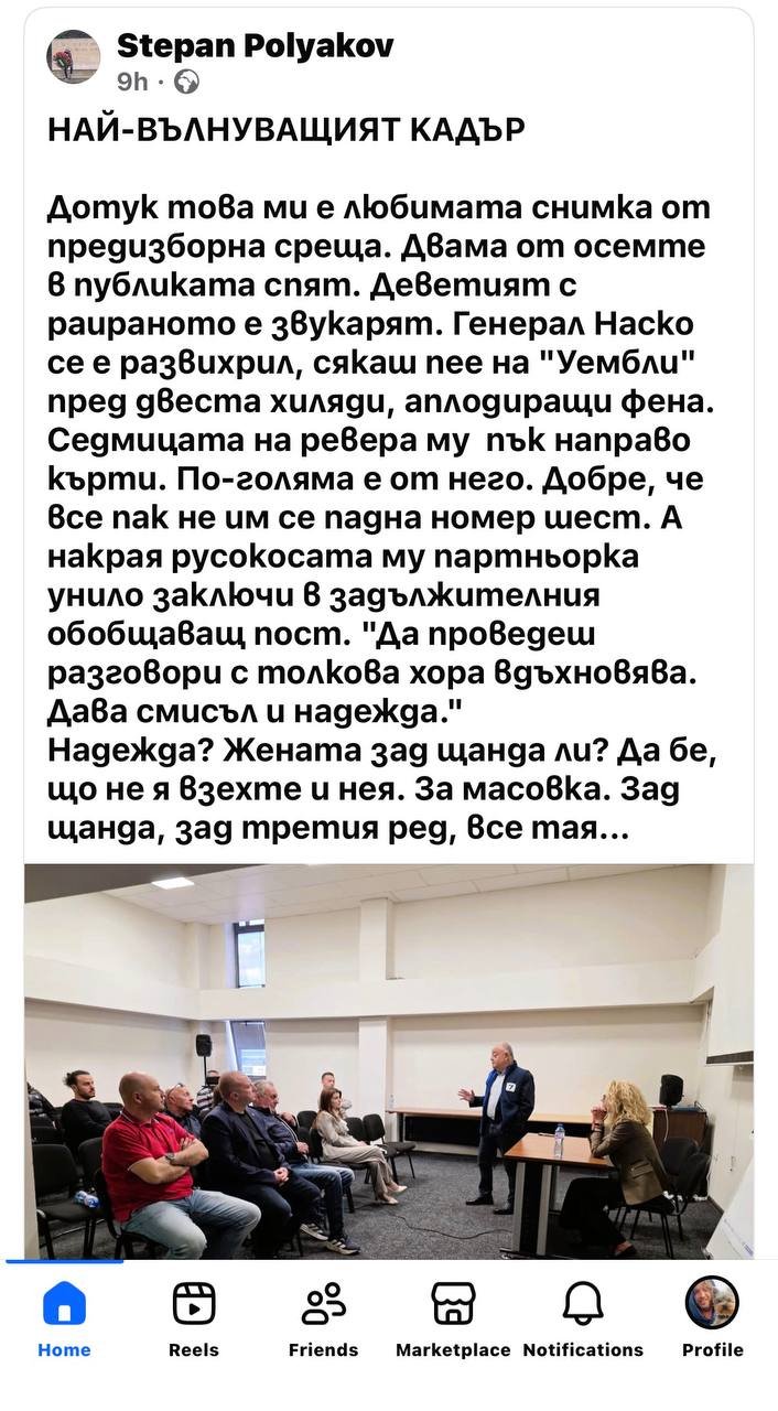 Дотук това ми е любимата снимка от предизборна среща. Двама от осемте в публиката спят. Деветият с раираното е звукарят. Генерал Наско се е развихрил, сякаш пее на "Уембли" пред двеста хиляди, аплодиращи фена. Седмицата на ревера му пък направо кърти. По-голяма е от него. Добре, че все пак не им се падна номер шест.