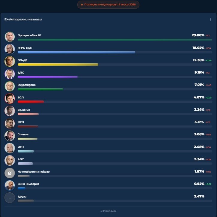 В първия ден от работата си – 5 април – платформата отчита водеща позиция за „Прогресивна България“. Формацията на Румен Радев получава 29,80%.