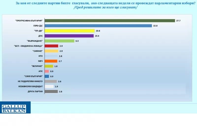 „Прогресивна България“ запазва първото място с 27,7% сред решилите за кого ще гласуват. Това обаче е спад спрямо 29,8% през февруари.