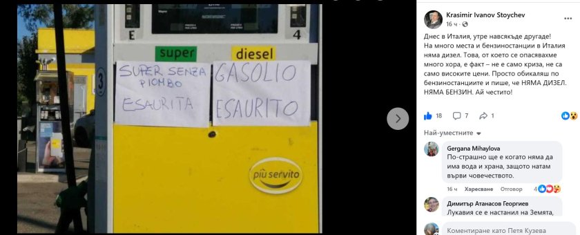 Снимка от Милано и кратък пост във „Фейсбук“ разпалиха тревога. Пловдивчанинът Красимир Стойчев, който живее в Ломбардия, показа надписи върху колонки на бензиностанции. Посланието е ясно: „НЯМА ДИЗЕЛ. НЯМА БЕНЗИН“. И добави предупреждение: „Днес в Италия, утре навсякъде другаде!“