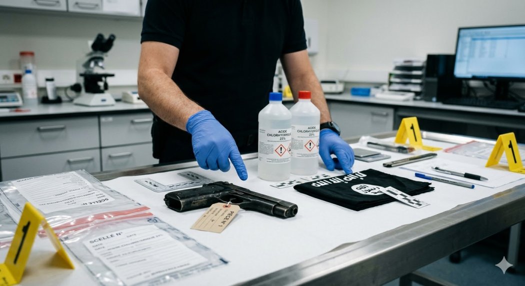 При претърсването в автомобила са открити зареден пистолет и бутилка със солна киселина. Намерено е и знаме на терористичната организация „Ислямска държава“. Тези находки са в основата на подозренията за подготвяна атака.