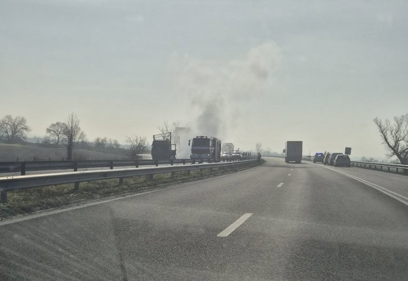 Движението в участъка е временно ограничено. Причината е горящият тежкотоварен автомобил, който трябва да бъде отстранен от пътното платно.