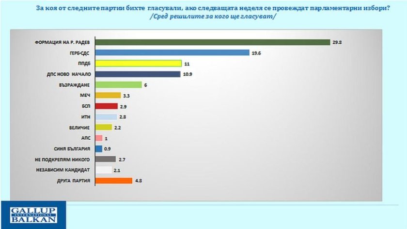 Национално проучване на „Галъп интернешънъл болкан“ показва сериозна преднина за формацията на Румен Радев с 29,8% сред решилите за кого ще гласуват. ГЕРБ-СДС са втори с 19,6%, а ПП–ДБ остават трети.