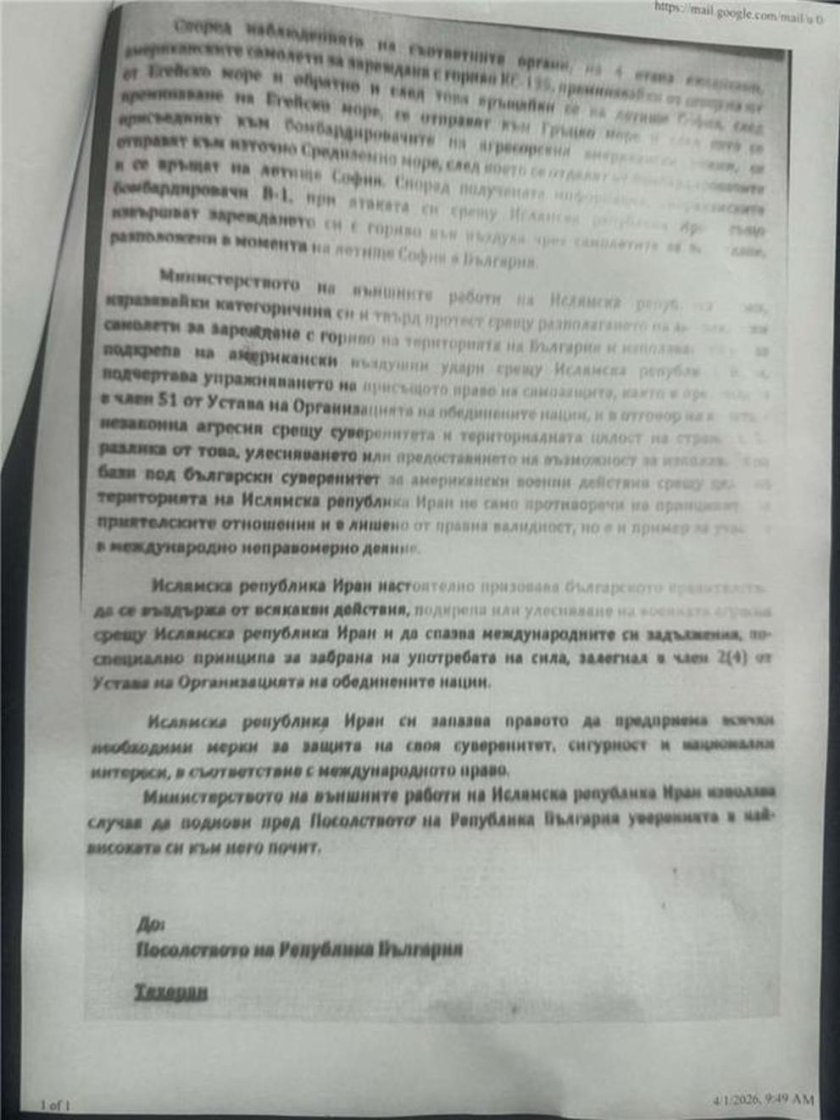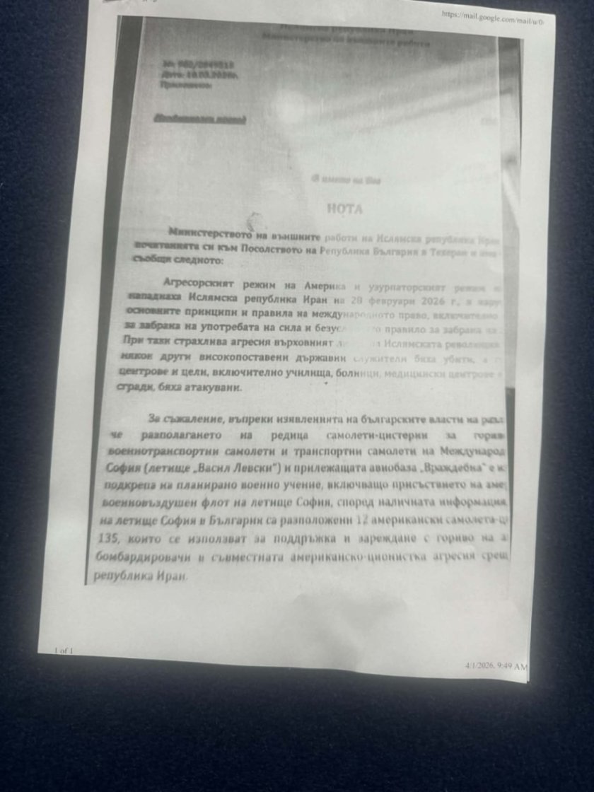 Публикуваха предполагаемия текст на нотата от Иран до МВнР (СНИМКИ)