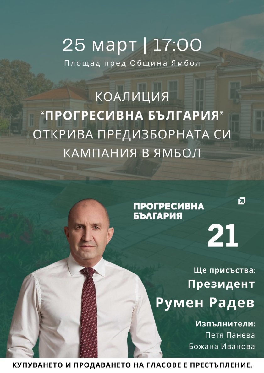 Лидерът на „Прогресивна България“ Румен Радев ще открие официално предизборната кампания на коалицията в Ямбол. Събитието е насрочено за днес от 17:00 часа на централния площад в града.