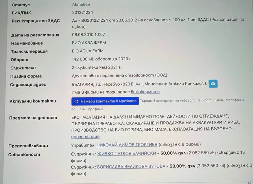 Излиза, че министърът на земеделието разчиства бизнес терен в полза на свой близък приятел. Няма да е трудно да предположим, че най-вероятно впоследствие Бачийски ще "почерпи" своя министър с някое и друго евро. Както пък може само да видите от снимката по-долу, фирмата за която лобира министър Христанов е 50% собственост на Бачийски - Старши. Другите 50% пък са на местния предприемач и бивш полицай Николай Георгиев.