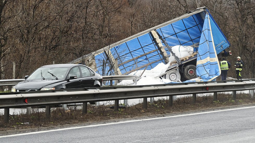 Тежкотоварен камион се обърна в канавката край пътното платно на автомагистрала „Тракия“. Инцидентът е станал в следобедните часове, малко преди тунела на 56-и километър.