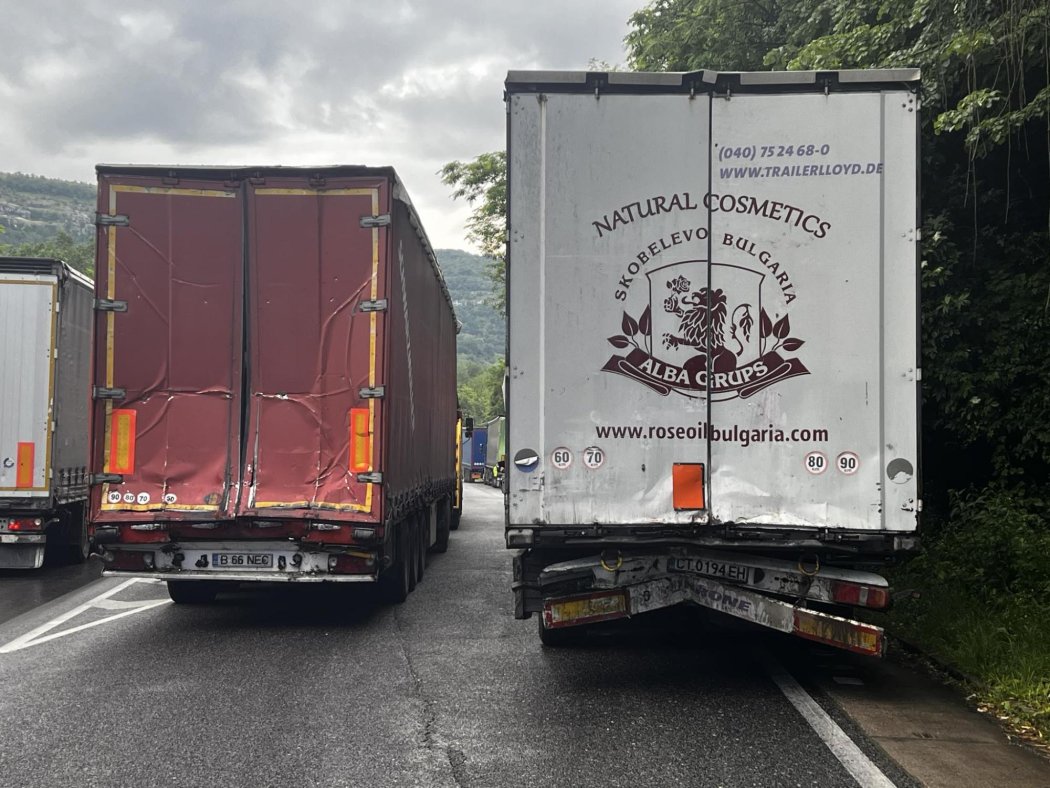 Инцидентът е край Вонеща вода. Няма пострадали, но трасето остава временно затворено до оглед и изтегляне на камионите.